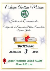 El Colegio Avelina Moreno invita a padres de familia, estudiantes y comunidad educativa a la Ceremonia de Certificación de Educación Básica Secundaria – Noveno Grado 🎉